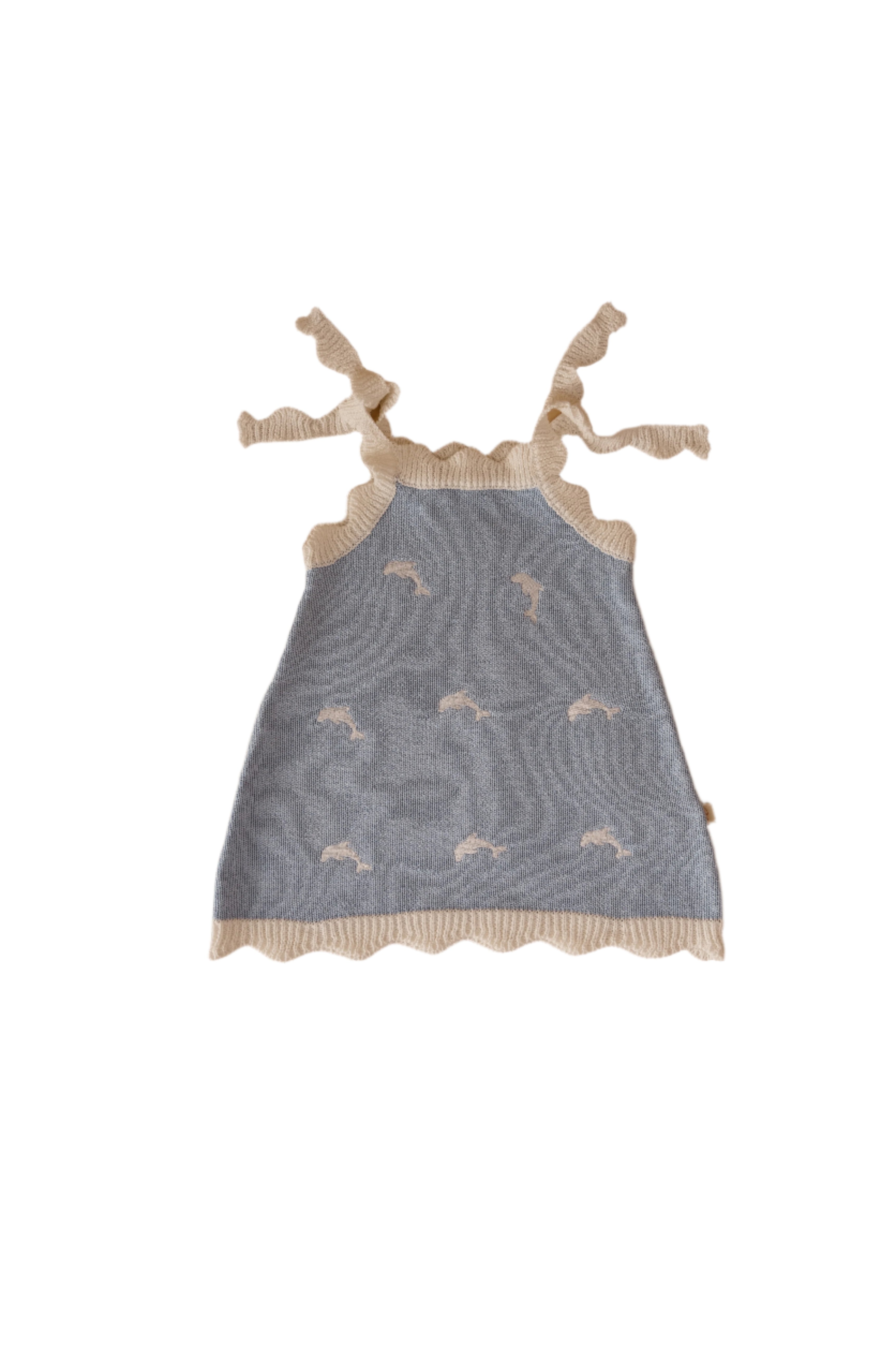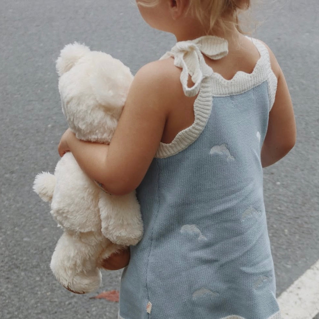The Dolphin Knit is made for sunshine + memory-making, with playful embroidery, scalloped edges, and adjustable straps for the perfect fit.
